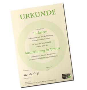 Die Auszeichnung „Bewährter Kraftfahrer“ gibt es in den folgenden Stufen: Bronze für 10 Jahre Fahrzeit